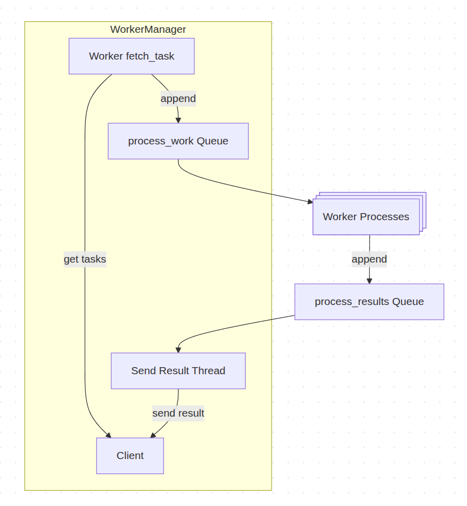 I’ve recently been working quite a bit on a worker application in python. This worker picks up tasks over a gRPC service executes those tasks, and publishes the results via gRPC. Because of python’s Global Interpreter Lock (GIL), threads don’t help for CPU intensive workloads. Instead, I’m using multiprocessing to run additional processes per worker and get better CPU utilization at the cost of using a ton of memory. When a python process opens a child process it can also share state with the child process. The most interesting of these are synchronization and communication primitives like Event, Queue, Pipe, and Lock. At a high level the worker’s workflow is: