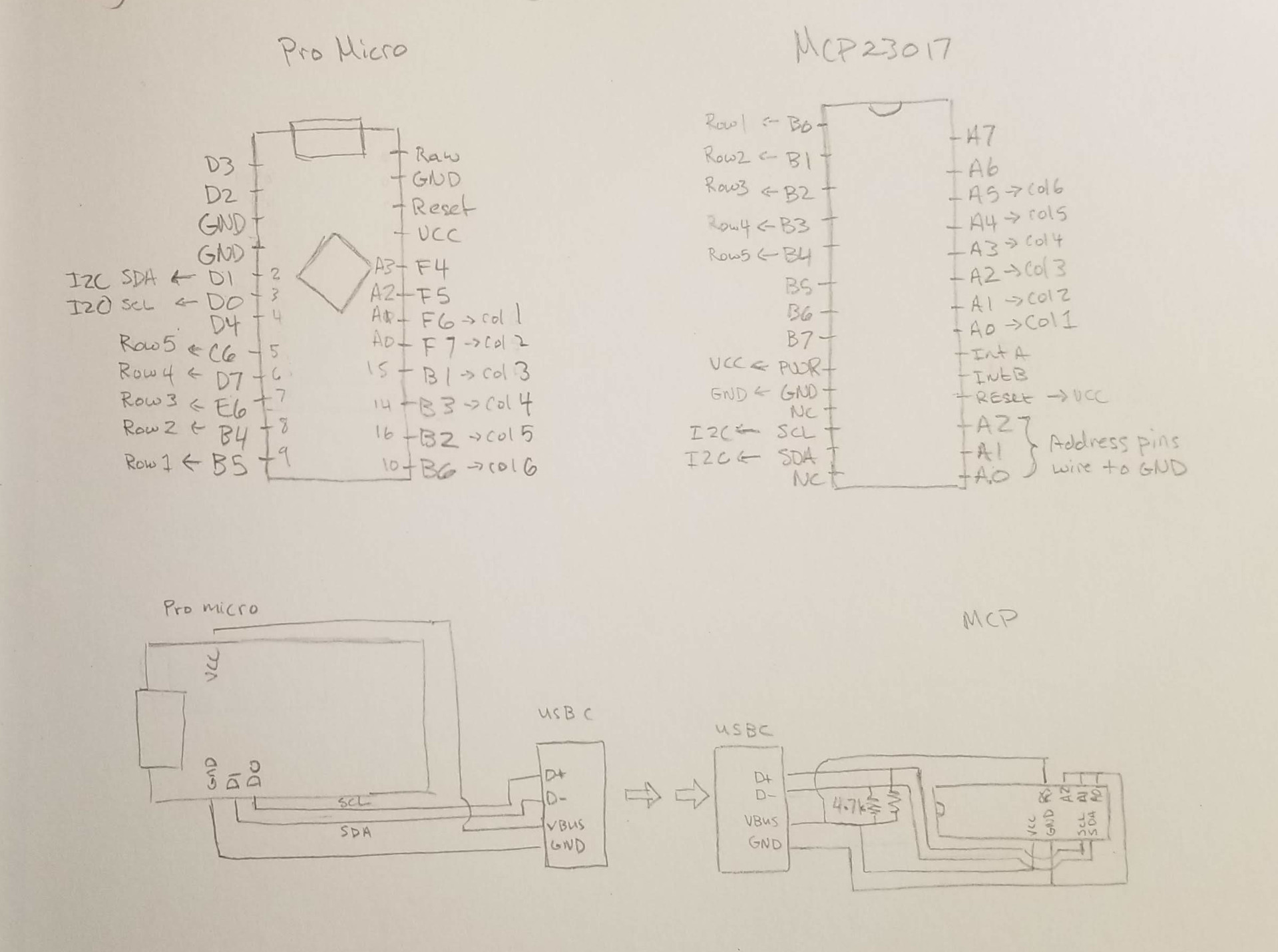 With a working prototype that included two halves, I sketched out wiring diagrams for the final build: