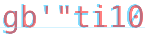 Over a week or so, I tried a number of commonly recommended fixed-width typefaces. I used each as my only typeface for at least an entire day. In the images below, Monaco is in blue, and the other typeface is in red. This allows easy comparison for sizing and appearance of a few glyphs.
